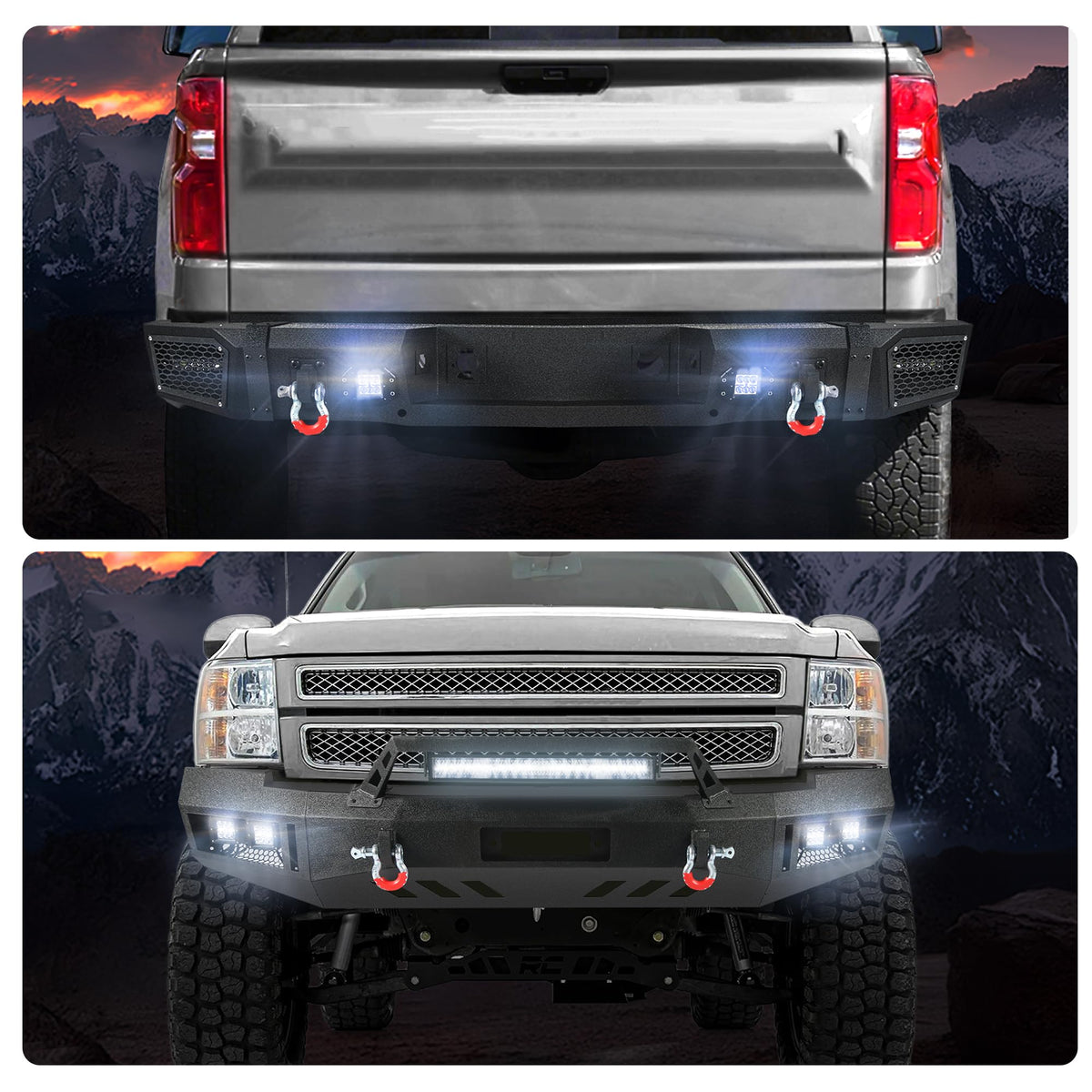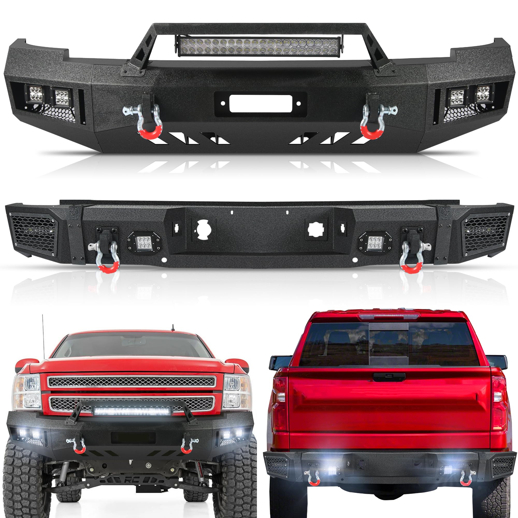 - El paquete incluye: Juego de parachoques delantero y trasero para Silverado 1500 (2007-2013), 9 luces de 18 W, herrajes de montaje e instrucciones de instalación. Se proporcionan instrucciones de instalación claras para su comodidad.