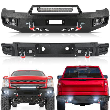 Off Road Front Rear Bumper Fit for Chevy Silverado 1500 2007-2013 Full Width Winch Bumper Combo Fit for 2nd Gen Silverado 1500 W/18W Lights D-Rings Sensor Holes Textured Black Steel Bumper Set