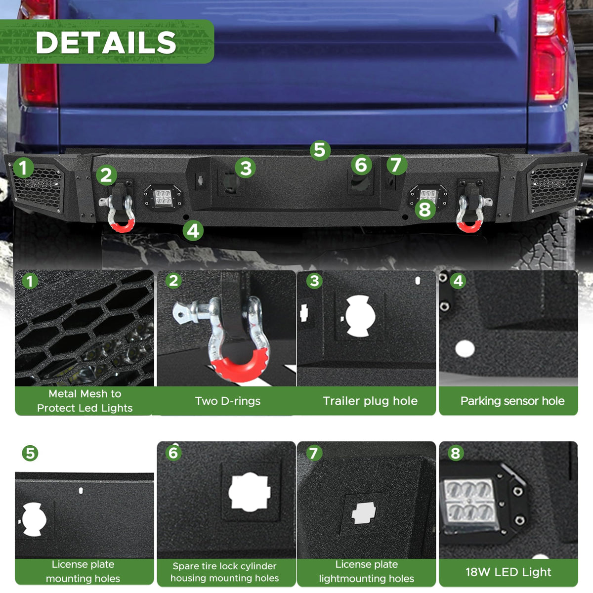 - Ajuste: El parachoques delantero y trasero todoterreno es compatible con Chevy Silverado 1500 (2007, 2008, 2009, 2010, 2011, 2012 y 2013). El parachoques delantero está equipado con 5 luces LED de 18 W. El parachoques trasero está equipado con 4 luces de 18 W. Confirme la información de su vehículo para confirmar si es compatible.