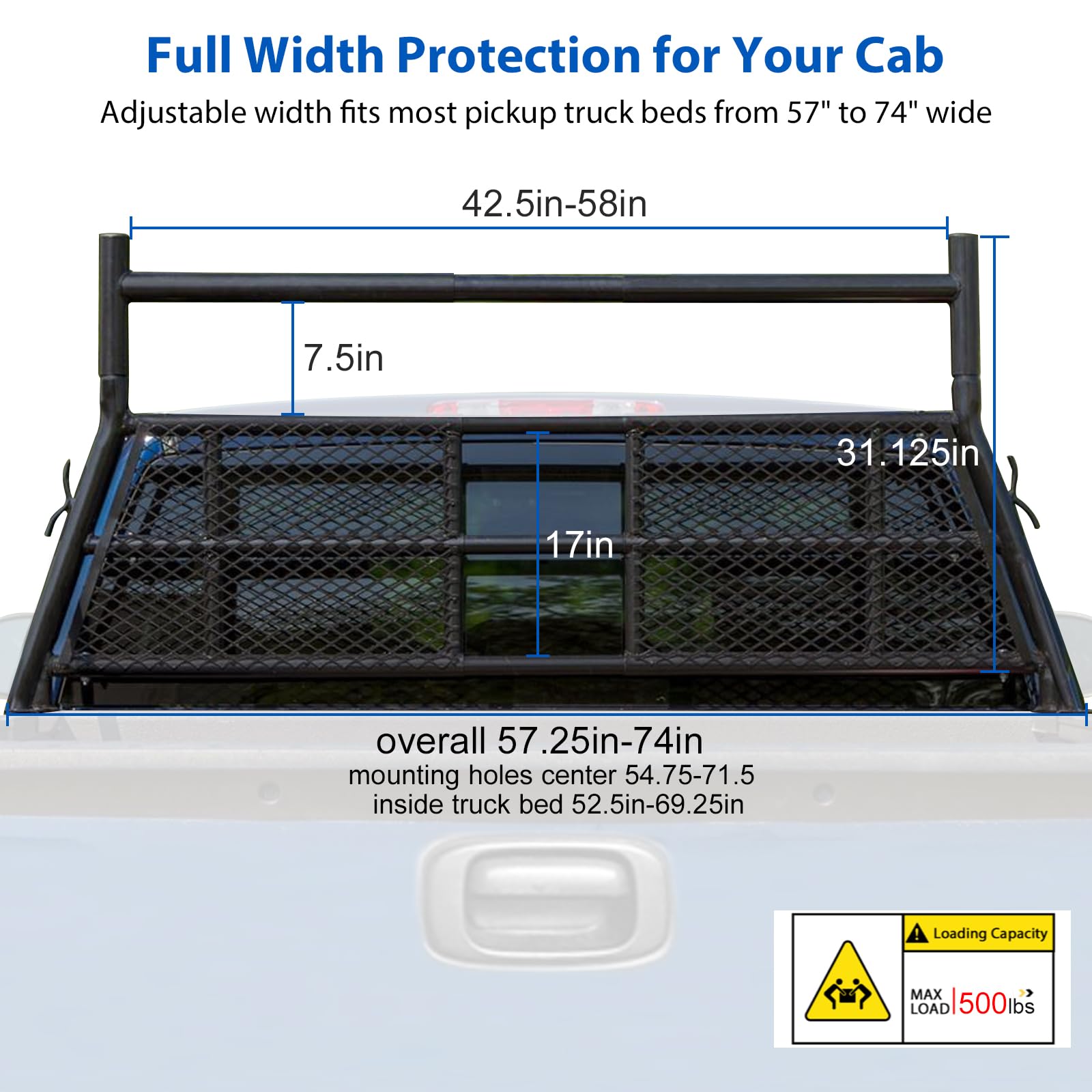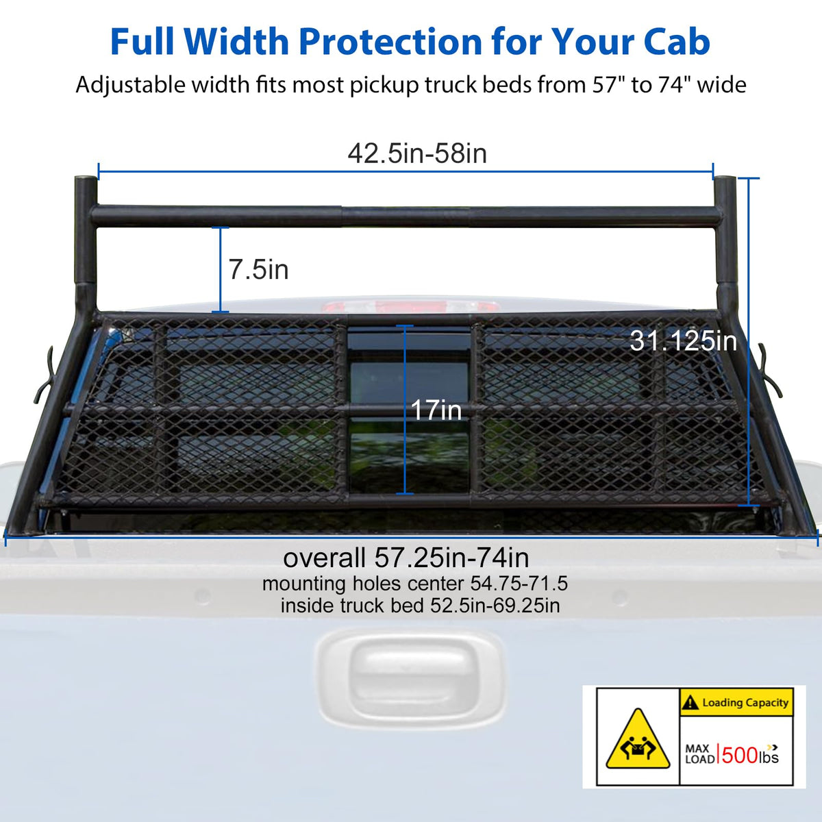 - Portaequipajes para camioneta ajustable, ancho ajustable de 57,25" a 74" para adaptarse a la mayoría de camionetas compactas y de tamaño completo.