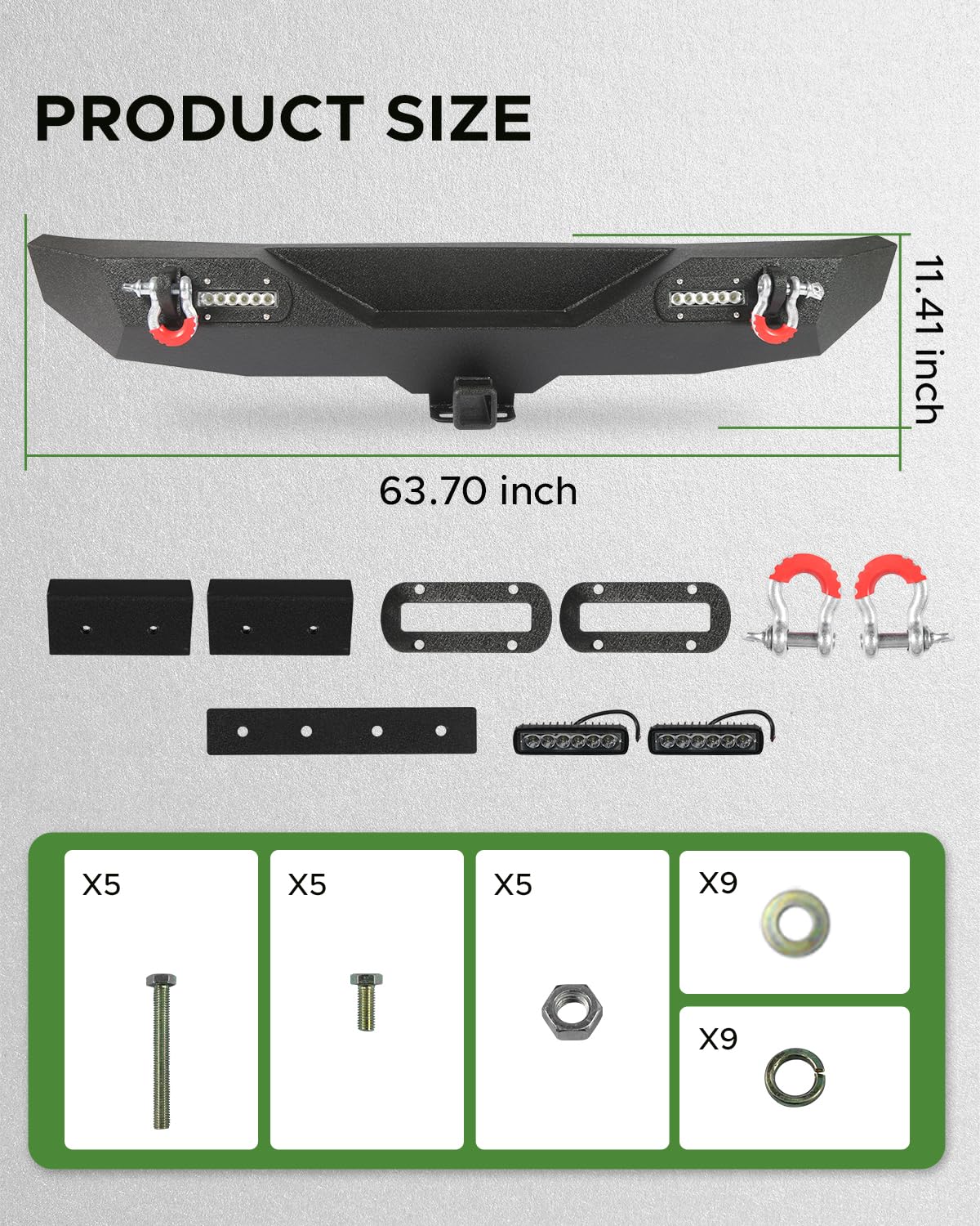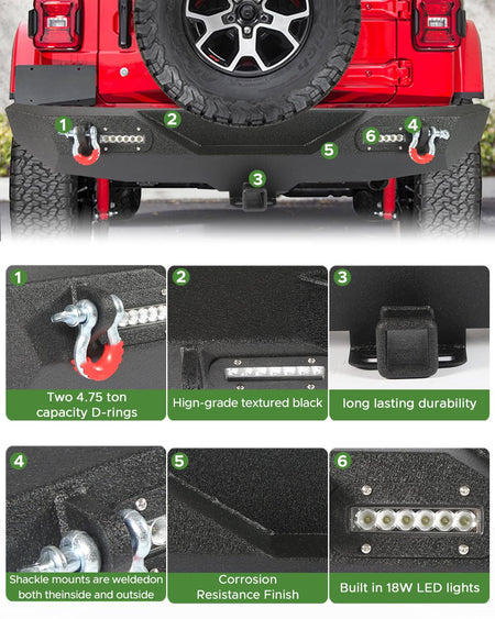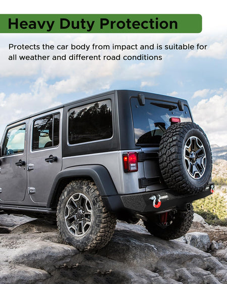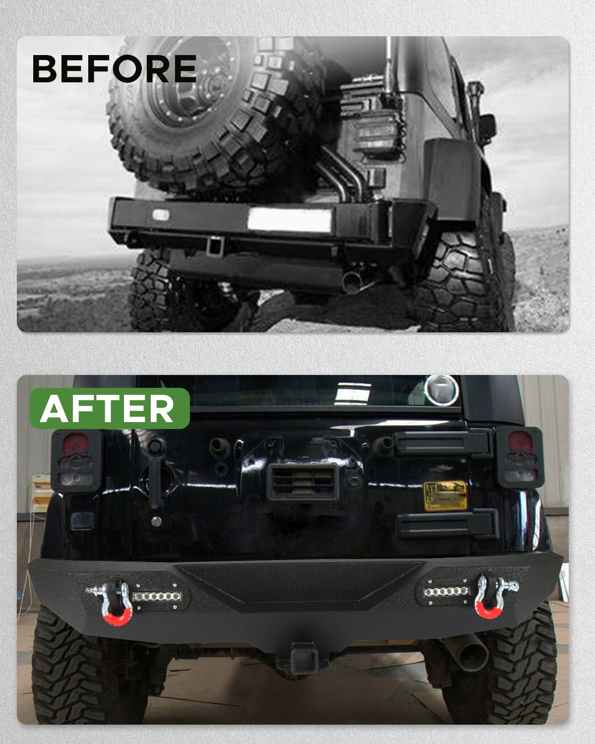 - Ajuste: Este parachoques trasero de ancho completo se adapta a Jeep Wrangler JK 2007 2008 2009 2010 2011 2012 2013 2014 2015 2016 2017 2018. Confirme la información de su vehículo antes de realizar el pedido.