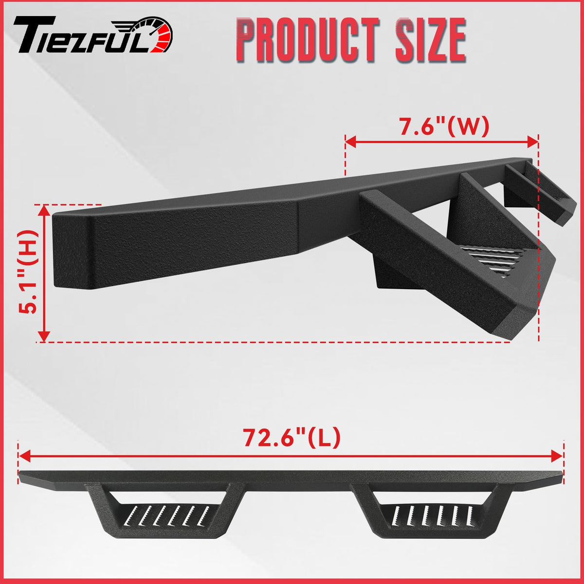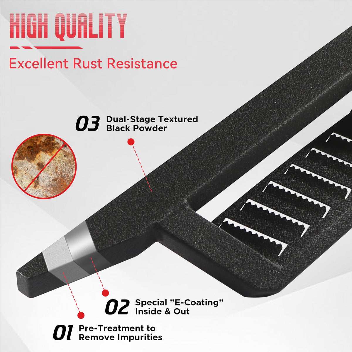 - Material de primera calidad: Nuestros escalones laterales están fabricados con acero al carbono de alta resistencia, capaz de soportar hasta 250 kg. Su acabado reforzado con pintura en polvo resiste la oxidación y las inclemencias del tiempo, garantizando una protección duradera y una elegante estética en negro mate.