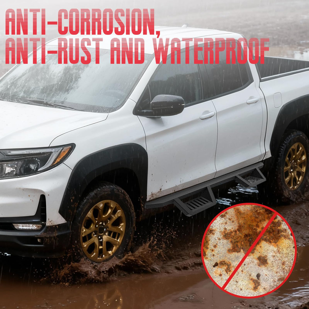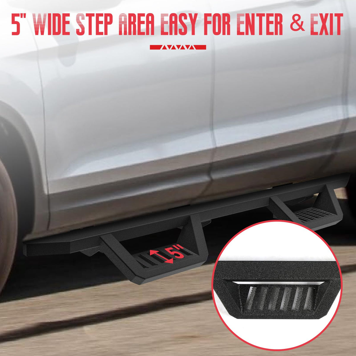 - Para toda ocasión: Estas defensas laterales de acero combinan un estilo robusto con un rendimiento práctico, lo que las hace ideales tanto para desplazamientos diarios como para aventuras todoterreno de fin de semana. Ofrecen un soporte resistente que facilita la entrada y salida del vehículo, garantizando una entrada y salida suave y segura.