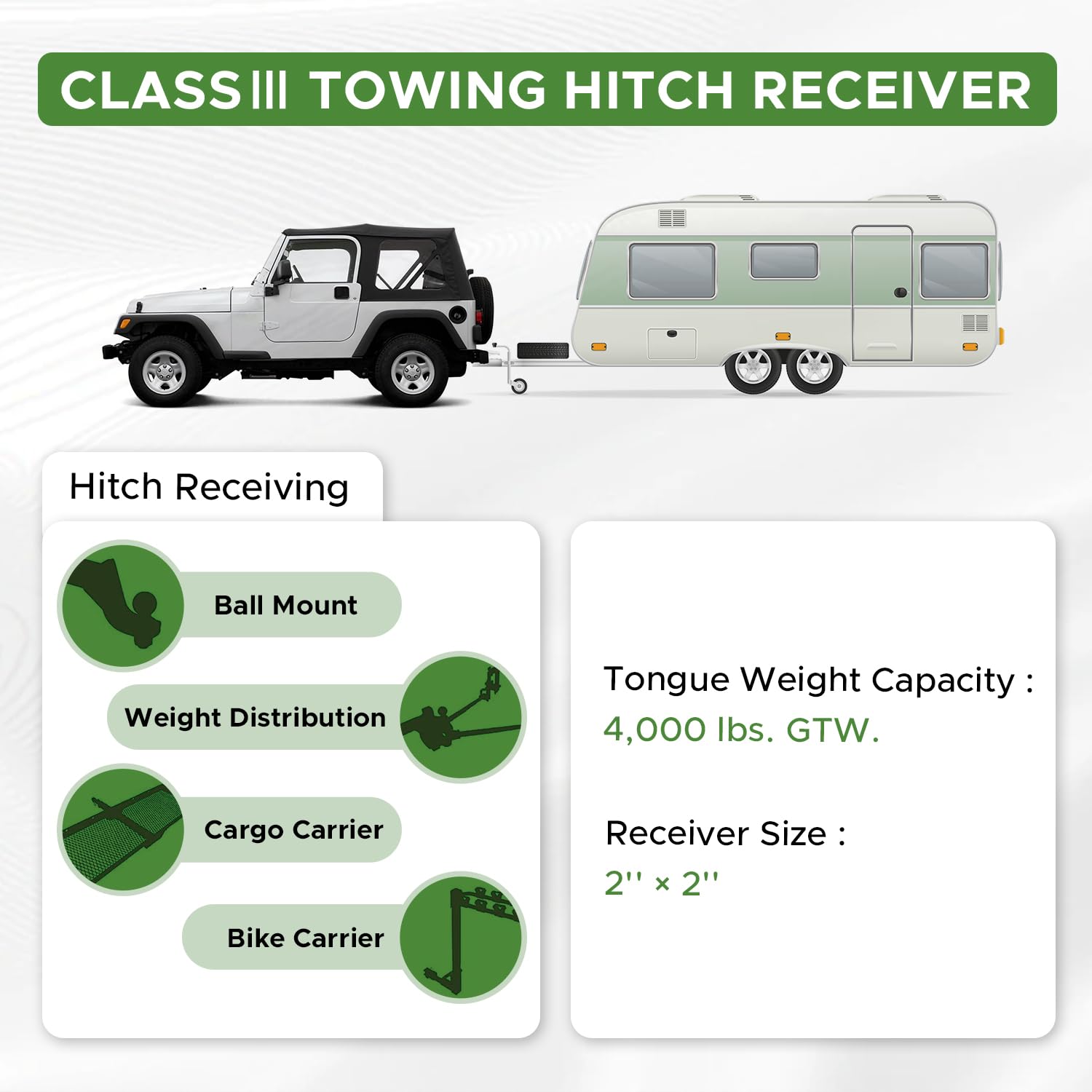 - VERSATILIDAD: Una vez que su vehículo esté equipado con el equipo receptor de remolque, mejorará el rendimiento del vehículo para remolcar el RV, el yate, cargar la bicicleta e incluso para operaciones de rescate.