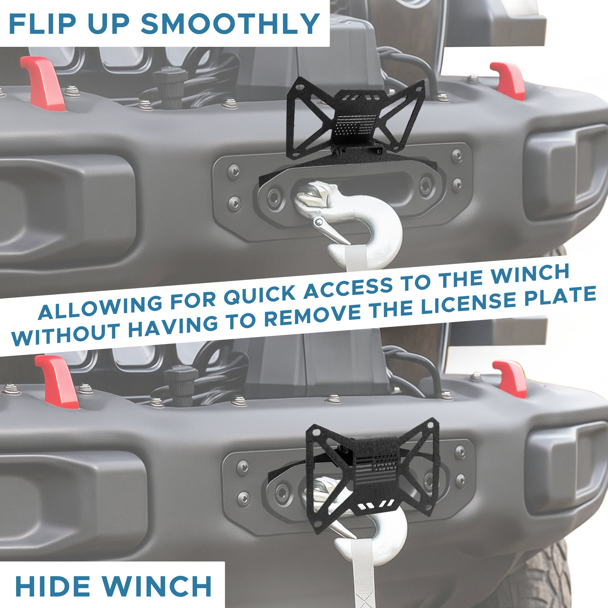 - Plegable 90°: este marco de matrícula con cabrestante de liberación rápida es fácil de levantar, lo que permite un acceso rápido al cabrestante sin quitar la matrícula. Puede plegarse 90 grados sin interferir con el cable del cabrestante, ocultando perfectamente el cabrestante.