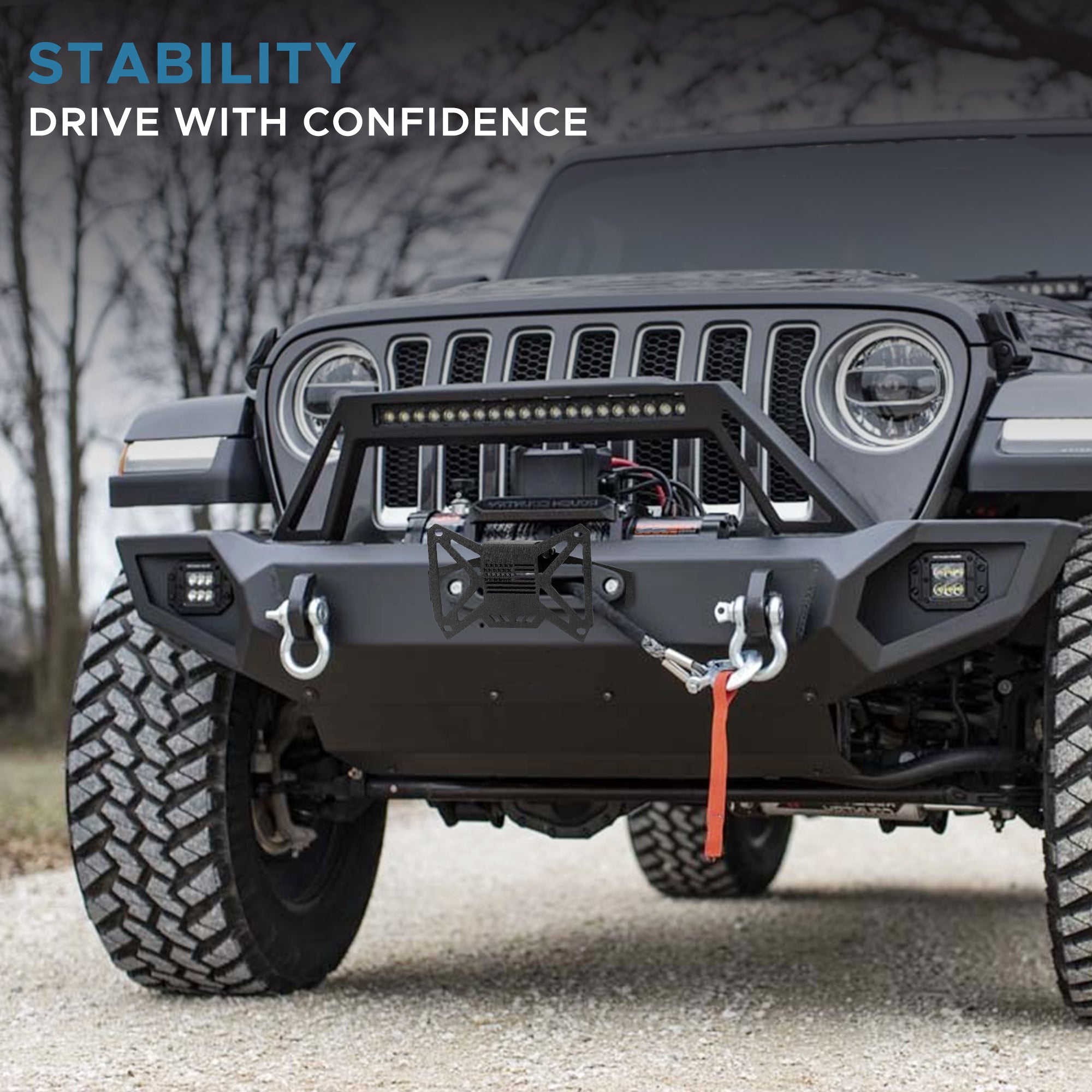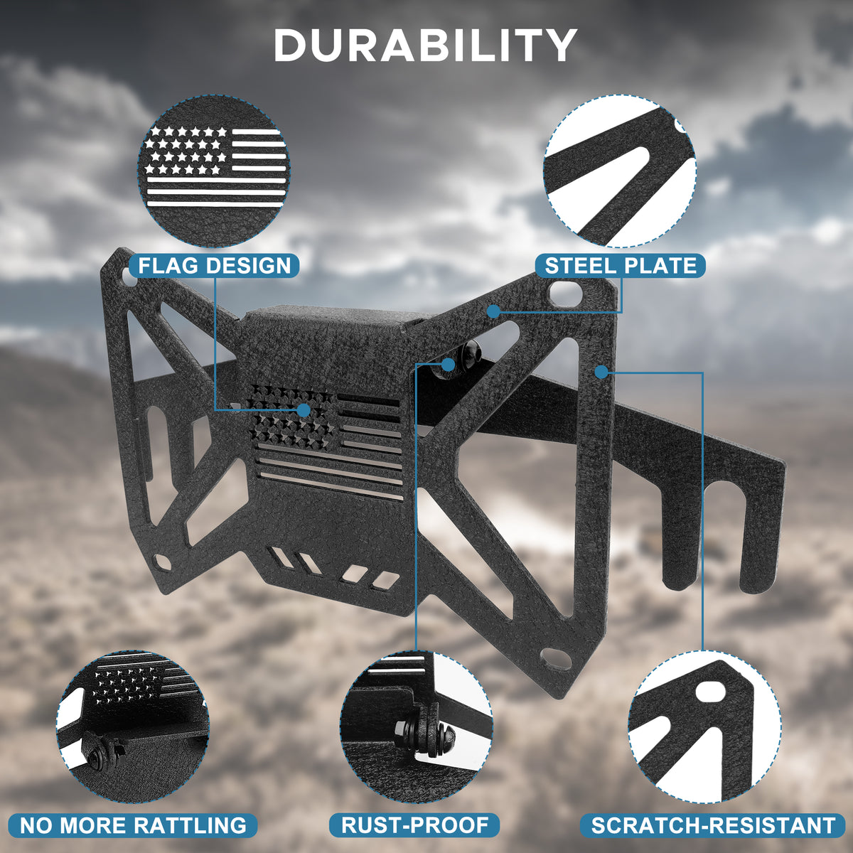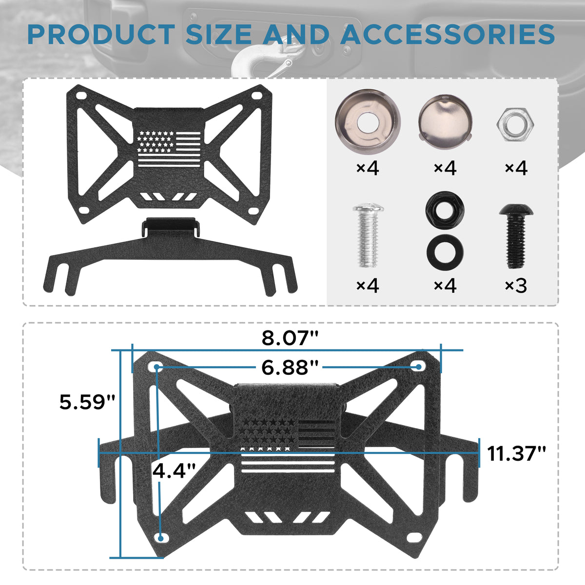 - Durabilidad: El soporte de matrícula para cabrestante de parachoques delantero está fabricado con acero resistente a la deformación para soportar vibraciones todoterreno, barro y condiciones climáticas adversas. Su acabado es resistente a rayones y óxido, e incluye un emblema de bandera en relieve ultrafino que realza su elegante apariencia.