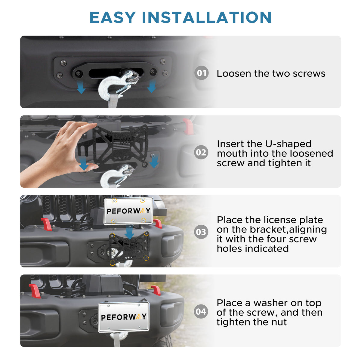 - Instalación rápida: El soporte para matrícula con cabrestante se instala directamente sin necesidad de taladrar ni modificar. Simplemente fije la matrícula en las cuatro esquinas directamente al soporte para una instalación rápida.