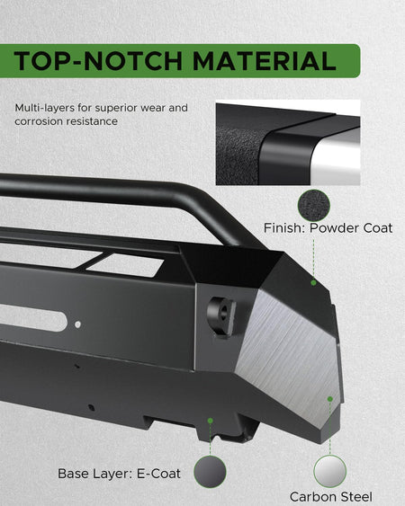 - Amélioration esthétique du véhicule : Notre pare-chocs avant renforcé pour Toyota Tacoma est fabriqué en acier haute résistance pour une excellente absorption des chocs. Son revêtement en poudre noir texturé en deux étapes lui confère style et protection renforcée. Résistant à la rouille, il garantit une performance et une esthétique durables, même en cas d'endommagement du revêtement.