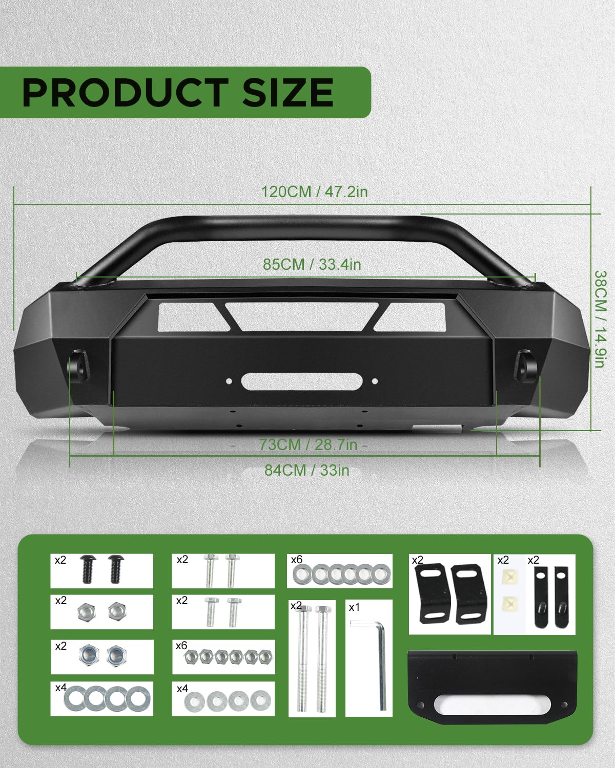 - Contenu de l'emballage : Vous recevrez 1 pare-chocs avant tout-terrain, 1 kit de fixation et 1 notice d'installation. Des instructions d'installation claires sont fournies pour faciliter votre installation. Veuillez noter que la garniture d'origine du pare-chocs doit être découpée pour l'installation. Les accessoires sont inclus dans le kit pare-chocs.