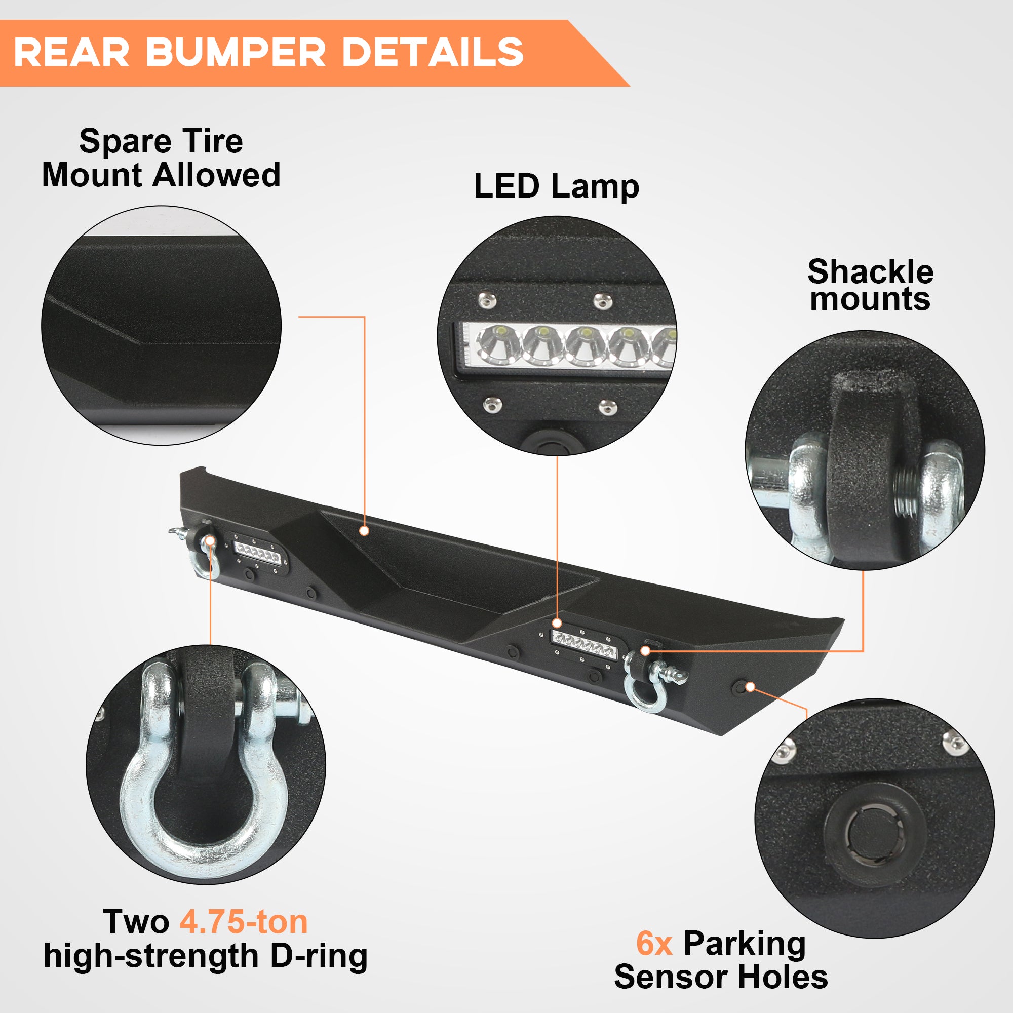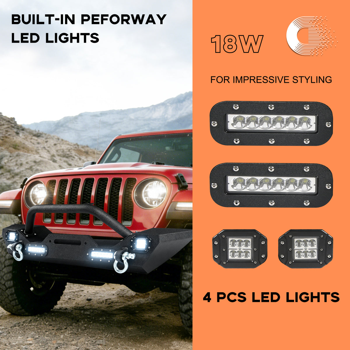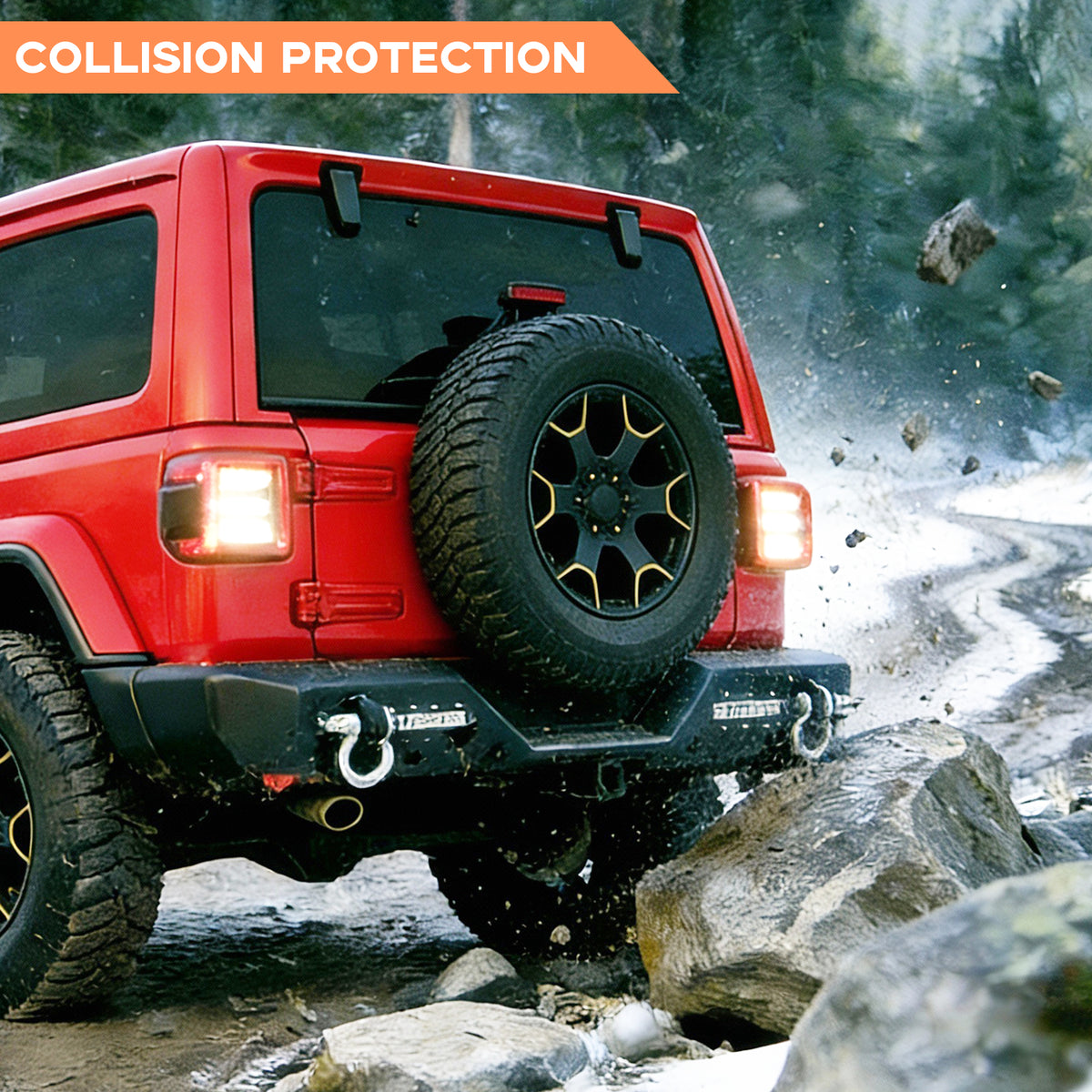 - Le pare-chocs avant et arrière tout-terrain, compatible avec la Jeep Wrangler JL, est équipé d'un projecteur haute puissance. Les LED offrent non seulement un rendu esthétique, mais aussi un éclairage et une sécurité optimaux sur les routes sombres.