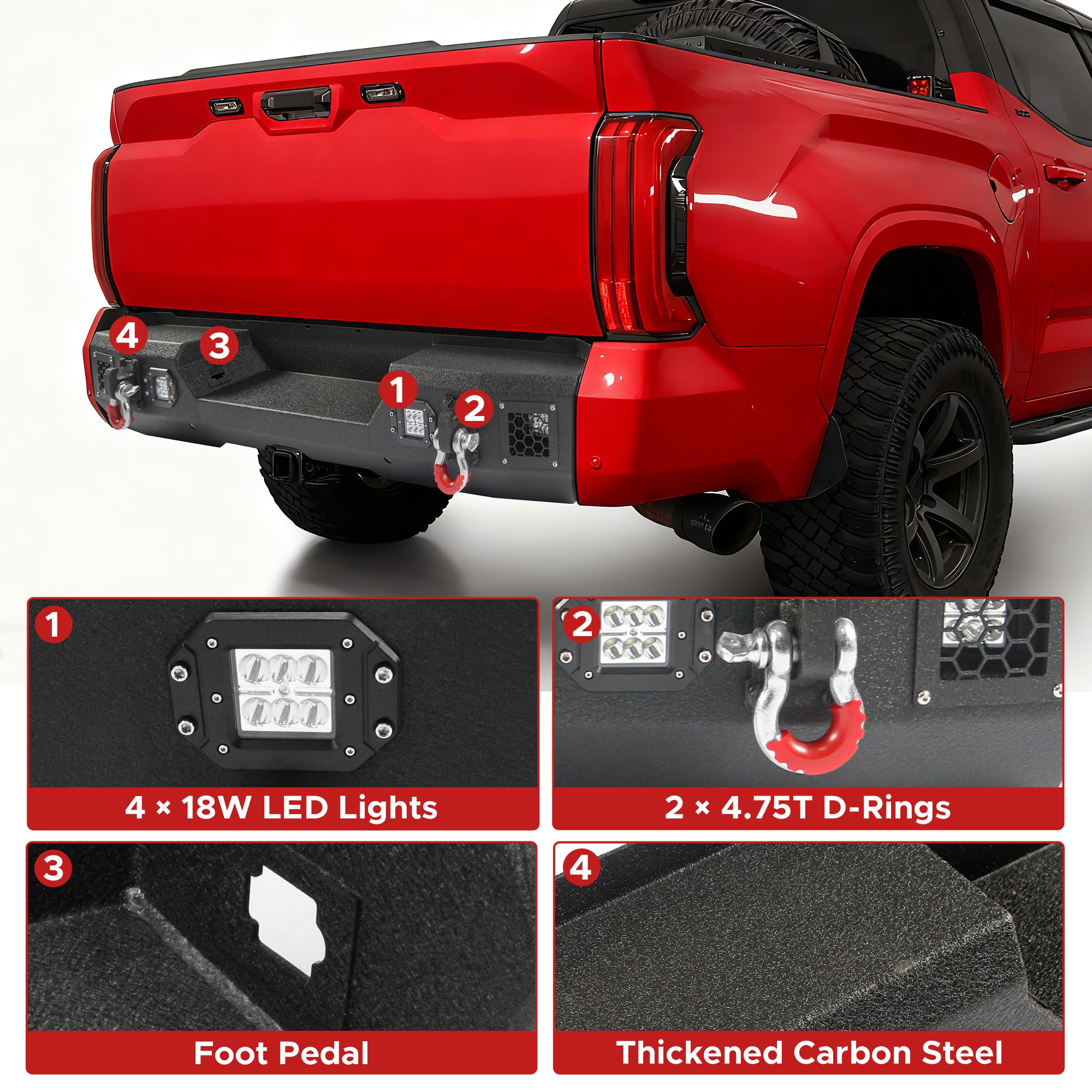 - Contenu de l'emballage : 1 pare-chocs avant compatible avec Toyota Tundra 2022-2025, 1 pare-chocs arrière compatible avec Toyota Tundra 2022-2025, 4 anneaux d'arrimage, 4 feux LED, 2 kits de fixation et une notice d'installation détaillée. Tous les éléments de récupération et accessoires de montage sont inclus pour une installation et une utilisation immédiates.