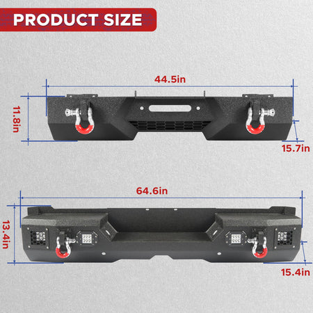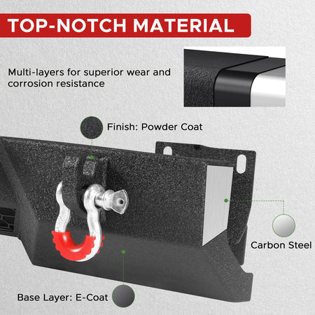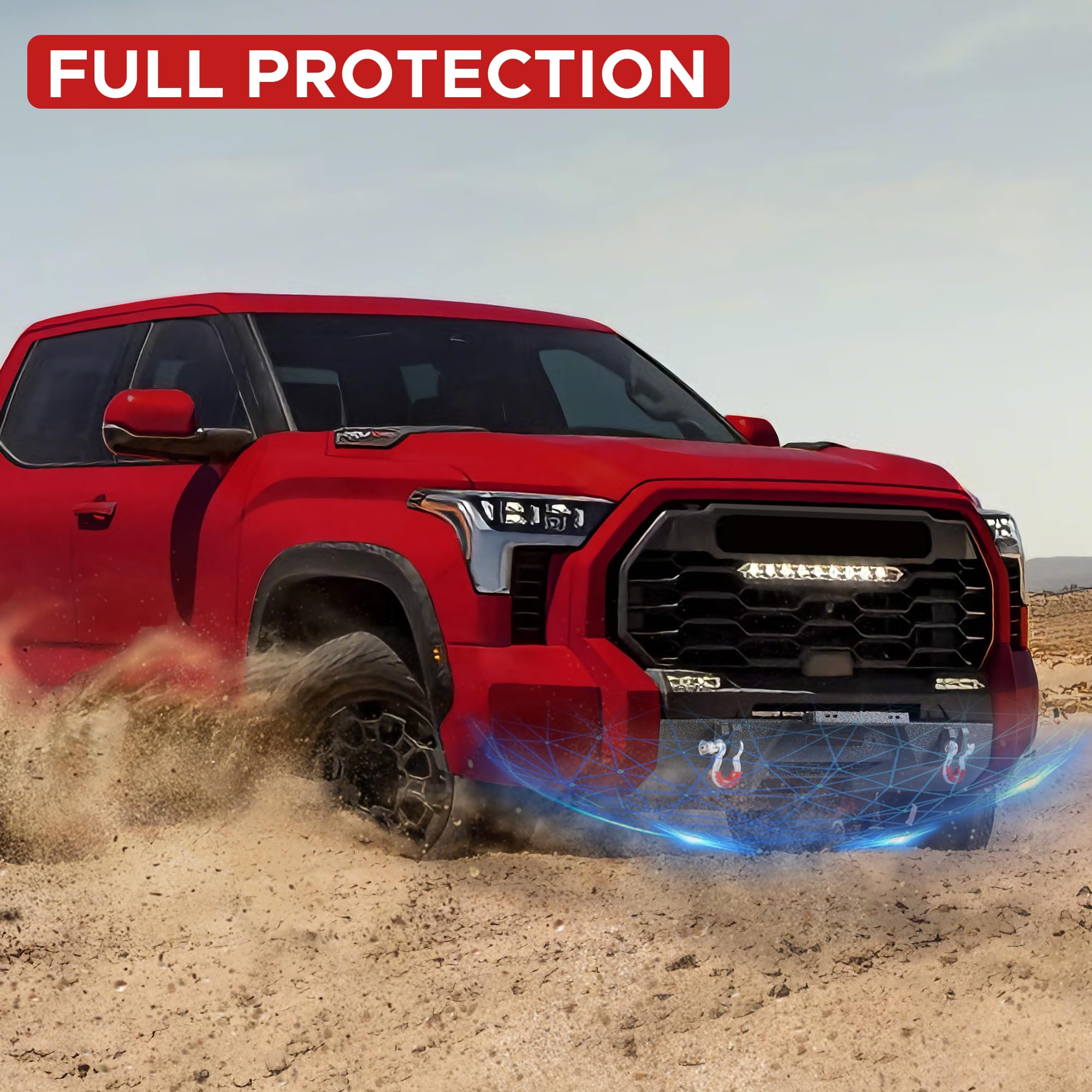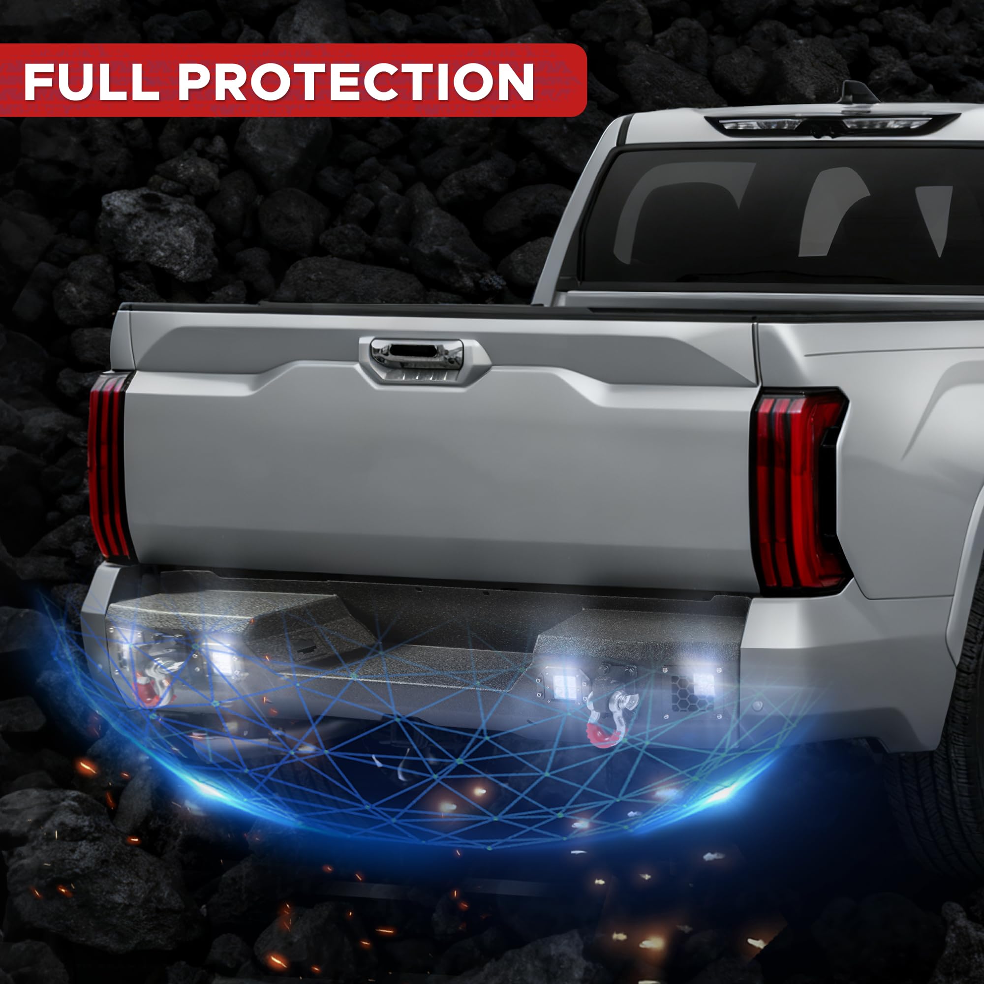 - Accessoires complets : Le pare-chocs avant est équipé d’une plaque de treuil supportant jusqu’à 5 443 kg (12 000 lb), de deux anneaux d’arrimage de 4,75 tonnes et d’un support de plaque d’immatriculation universel. Le pare-chocs arrière comprend quatre puissants phares à DEL de 18 W, deux anneaux d’arrimage de 4,75 tonnes, deux emplacements pour capteurs de stationnement et des trous pré-percés pour la plaque d’immatriculation et son éclairage. Cet ensemble de pare-chocs avant et arrière est compatible avec le Tundra et vous prépare à une utilisation quotidienne et à vos aventures hors route.
