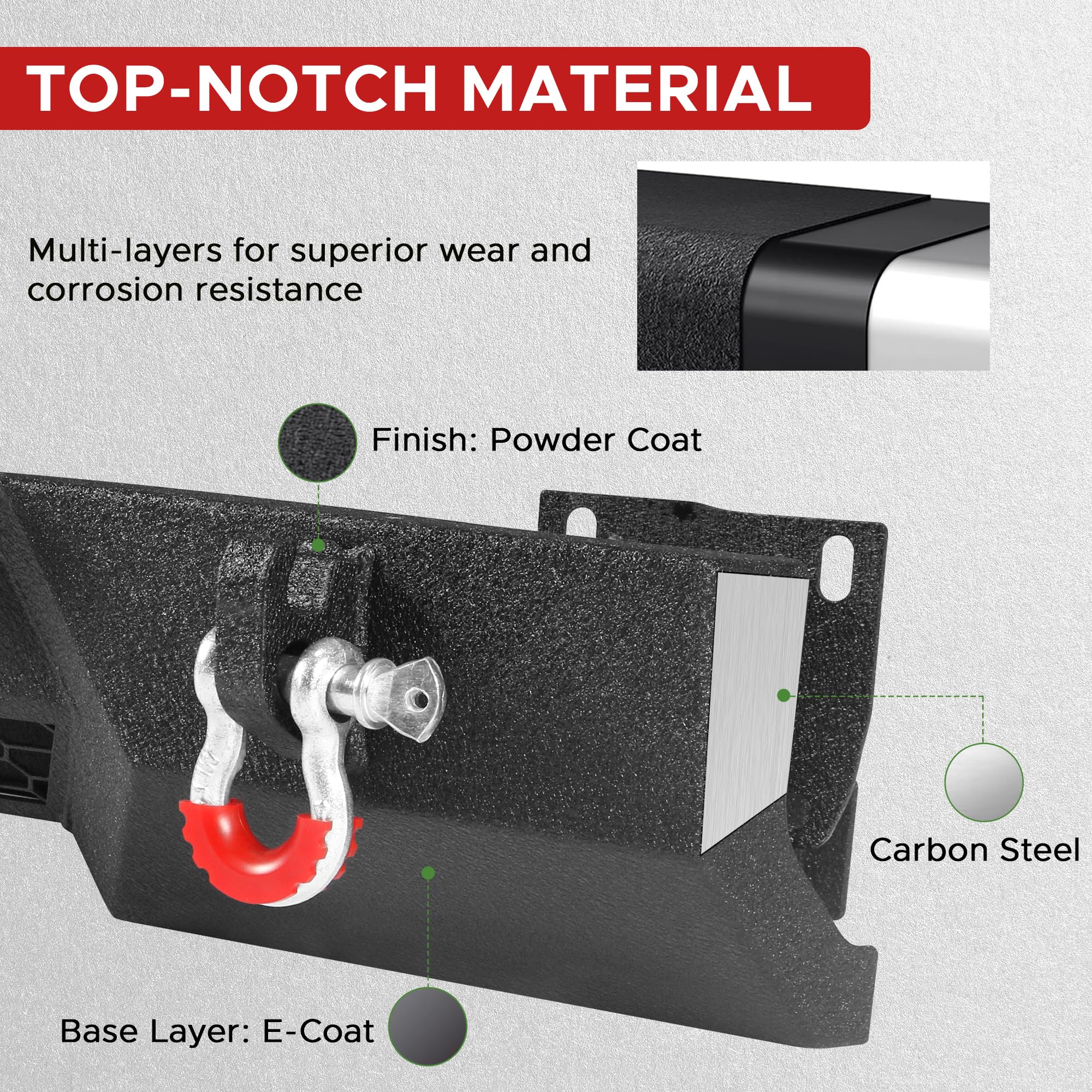 - Construction robuste : Fabriqué en acier haute résistance avec un revêtement en poudre texturé noir en deux étapes, cet ensemble de pare-chocs avant et arrière renforcés, compatible avec le Tundra de 3e génération, offre une protection exceptionnelle contre les impacts et la rouille tout en conservant son aspect robuste.