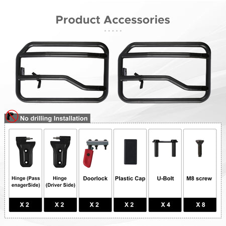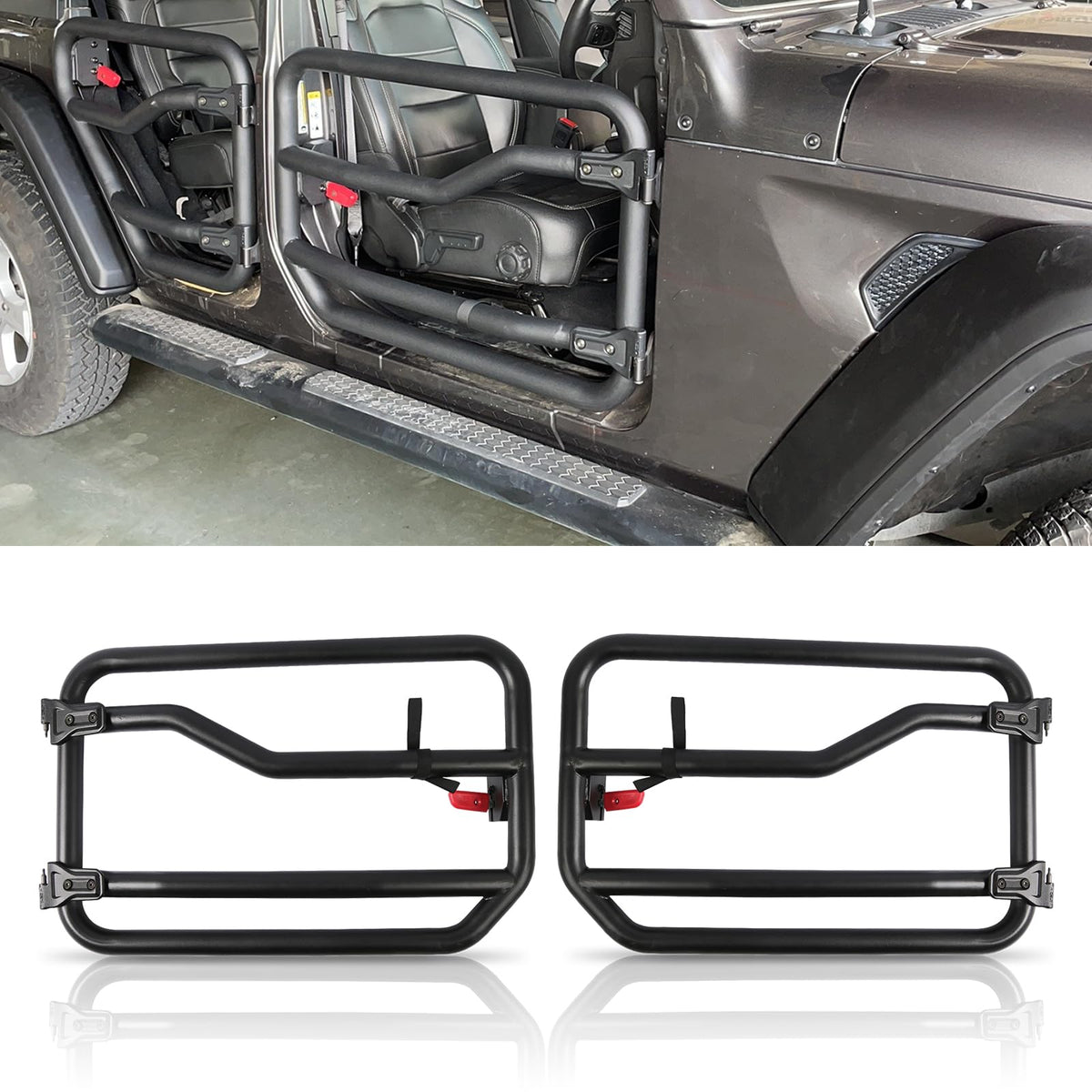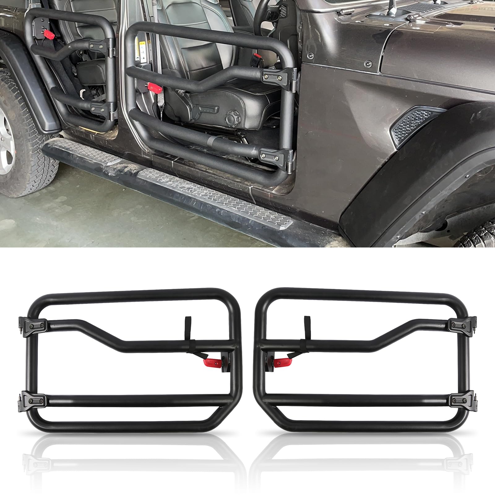 - Compatibilité : Ces demi-portes tubulaires sont compatibles avec les Jeep Gladiator JT (2020-2025) et Wrangler JL (2018-2025). Le kit comprend uniquement 2 portes avant.