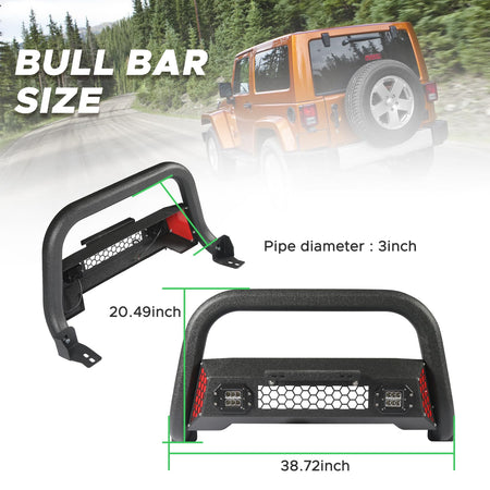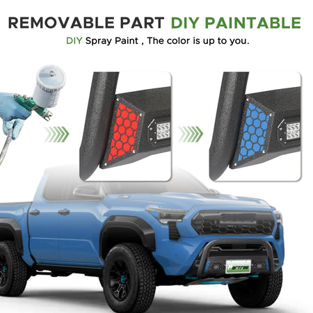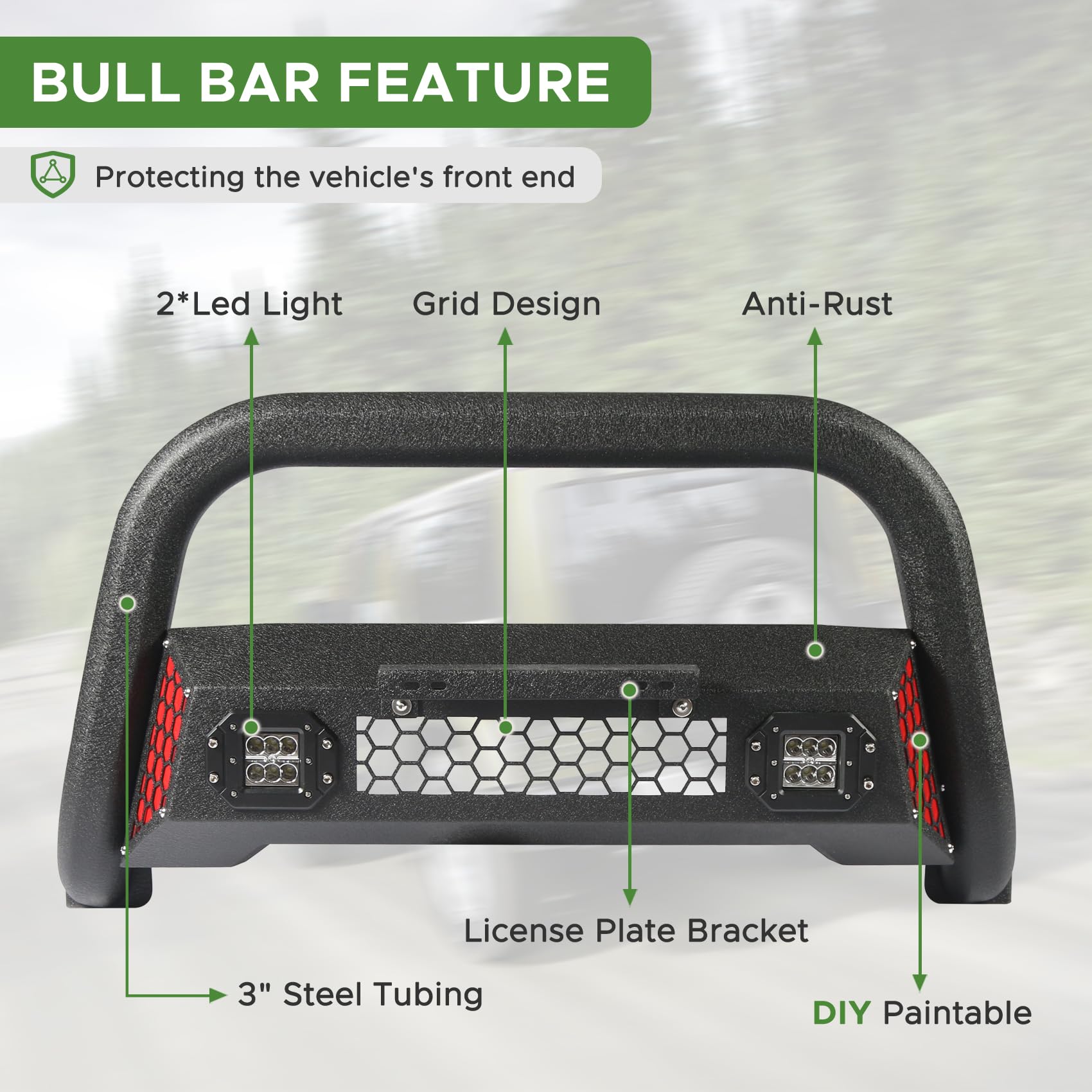 - Enhance Off-road: The bull bar fit for Toyota Tacoma with LED light illuminate the darkest trails, making night adventures a breeze. Off-road brush push bar includes a license plate bracket, keeping your plate firmly in place on rough terrains. The trim panel of the off-road bull bar can be free-painted, the color is up to you