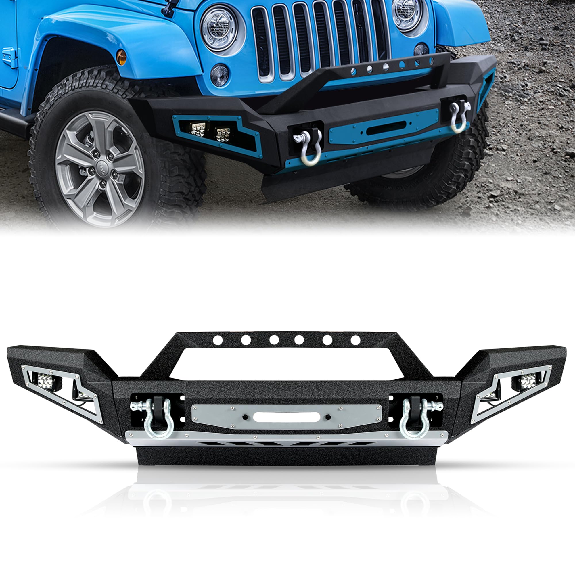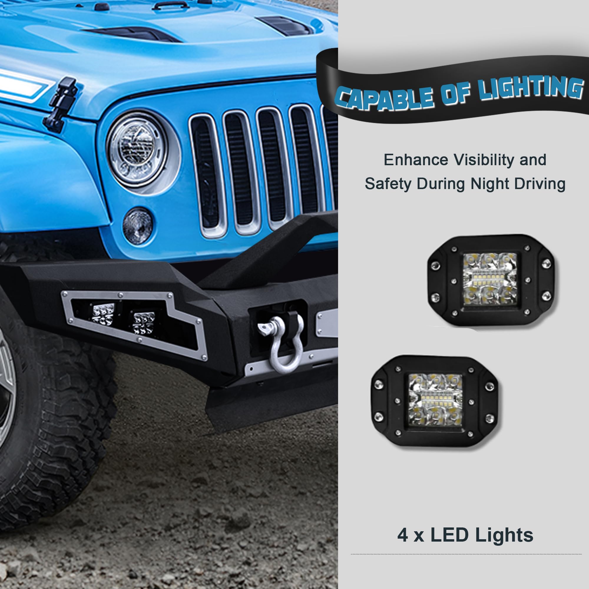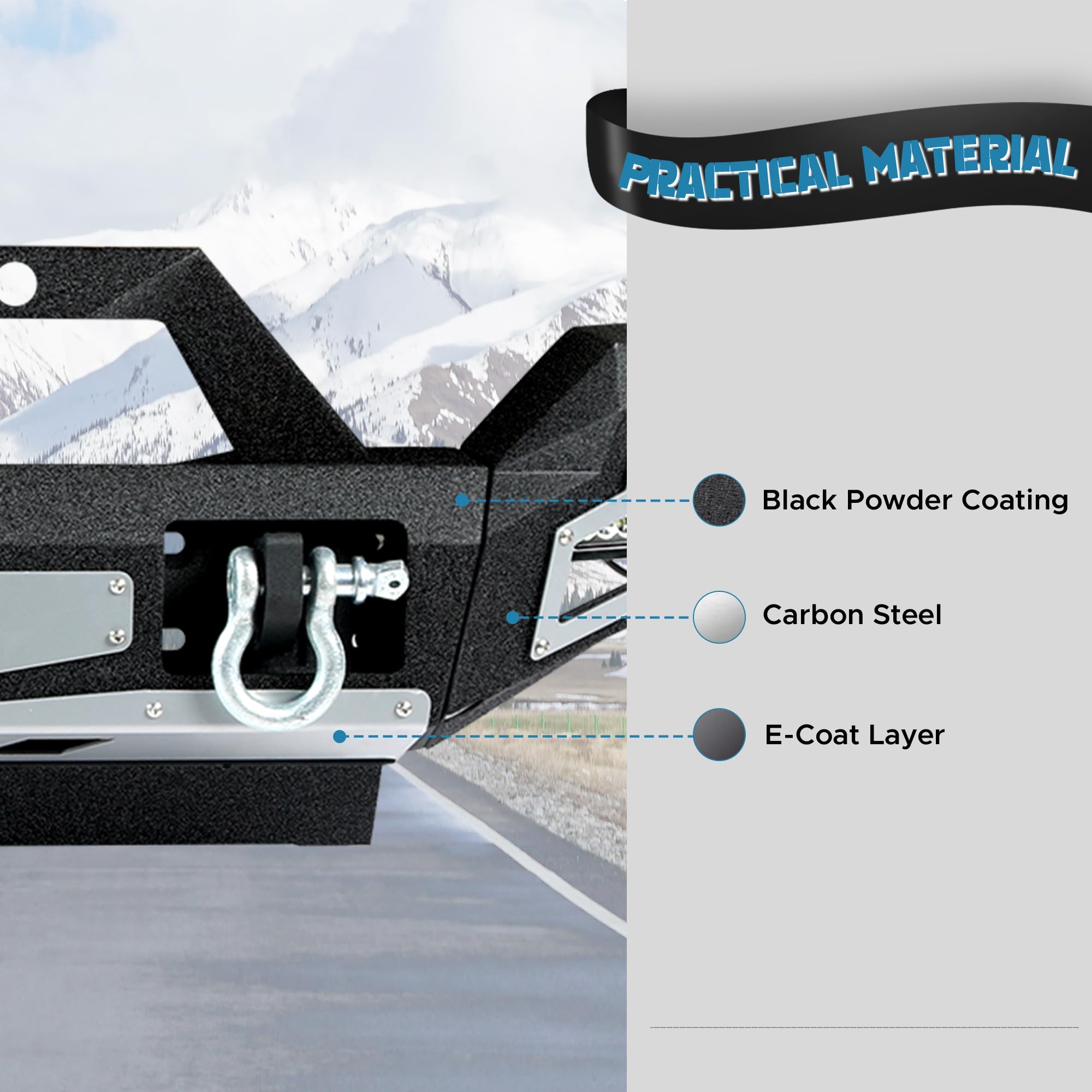 - Off-Road Upgrades: The carbon steel front bumper has a built-in winch plate that can hold up to 12,000 lbs. and two 4.75-ton load capacity D-rings, making it easy to tow the vehicle in difficult situations without damaging the bumper. Built-in 4 lights for added illumination at night