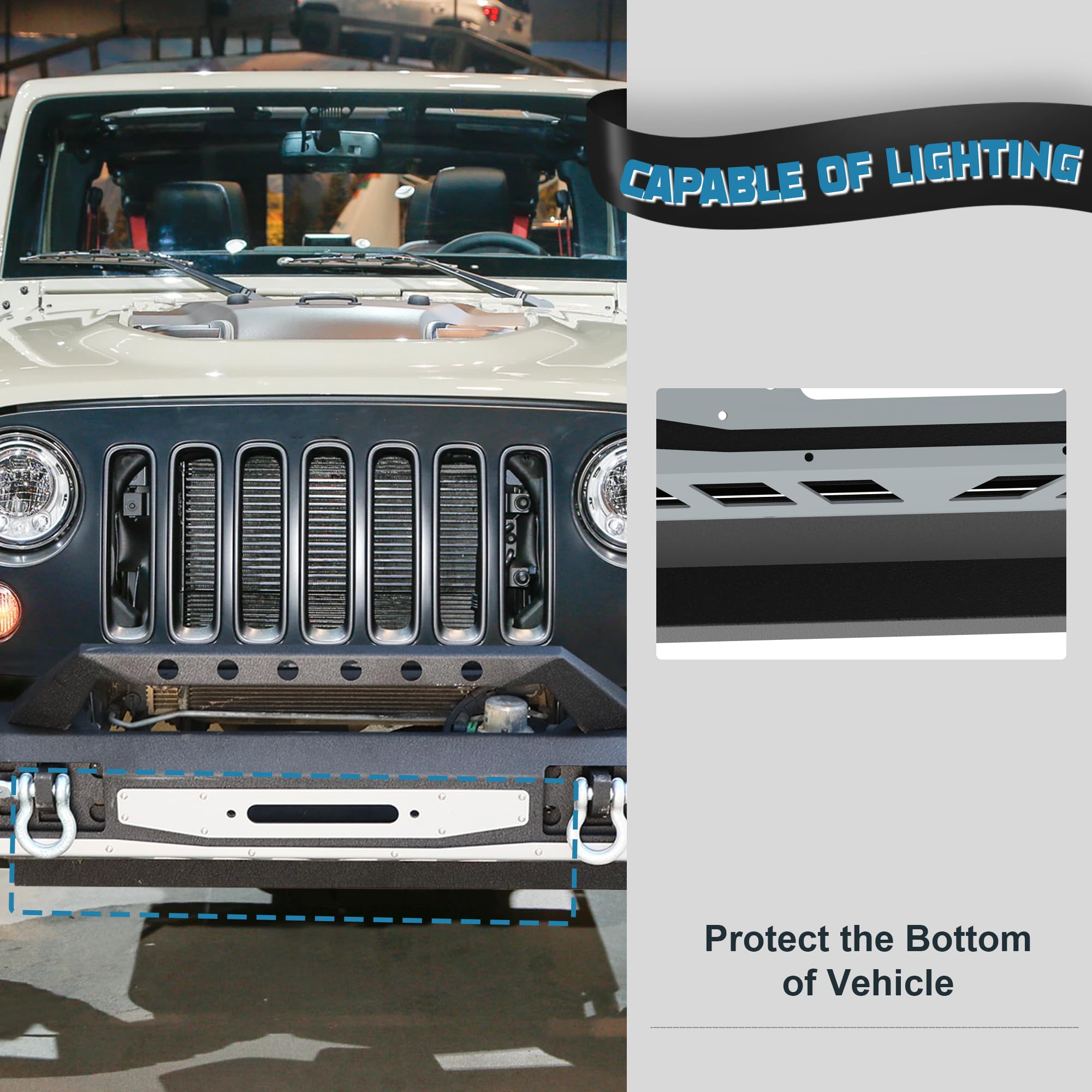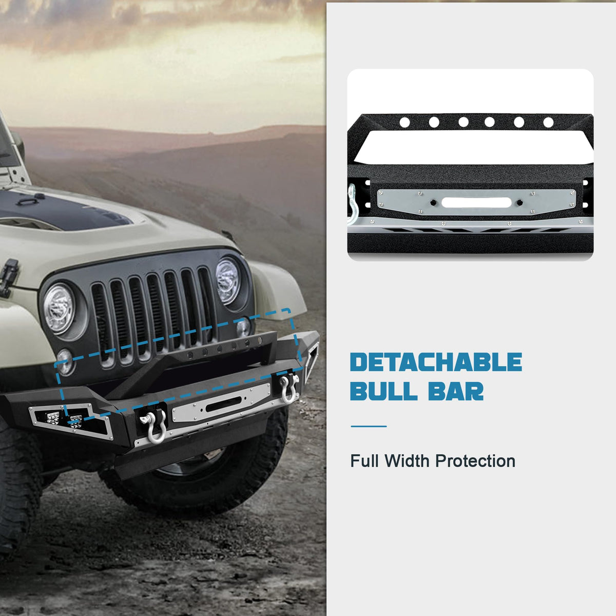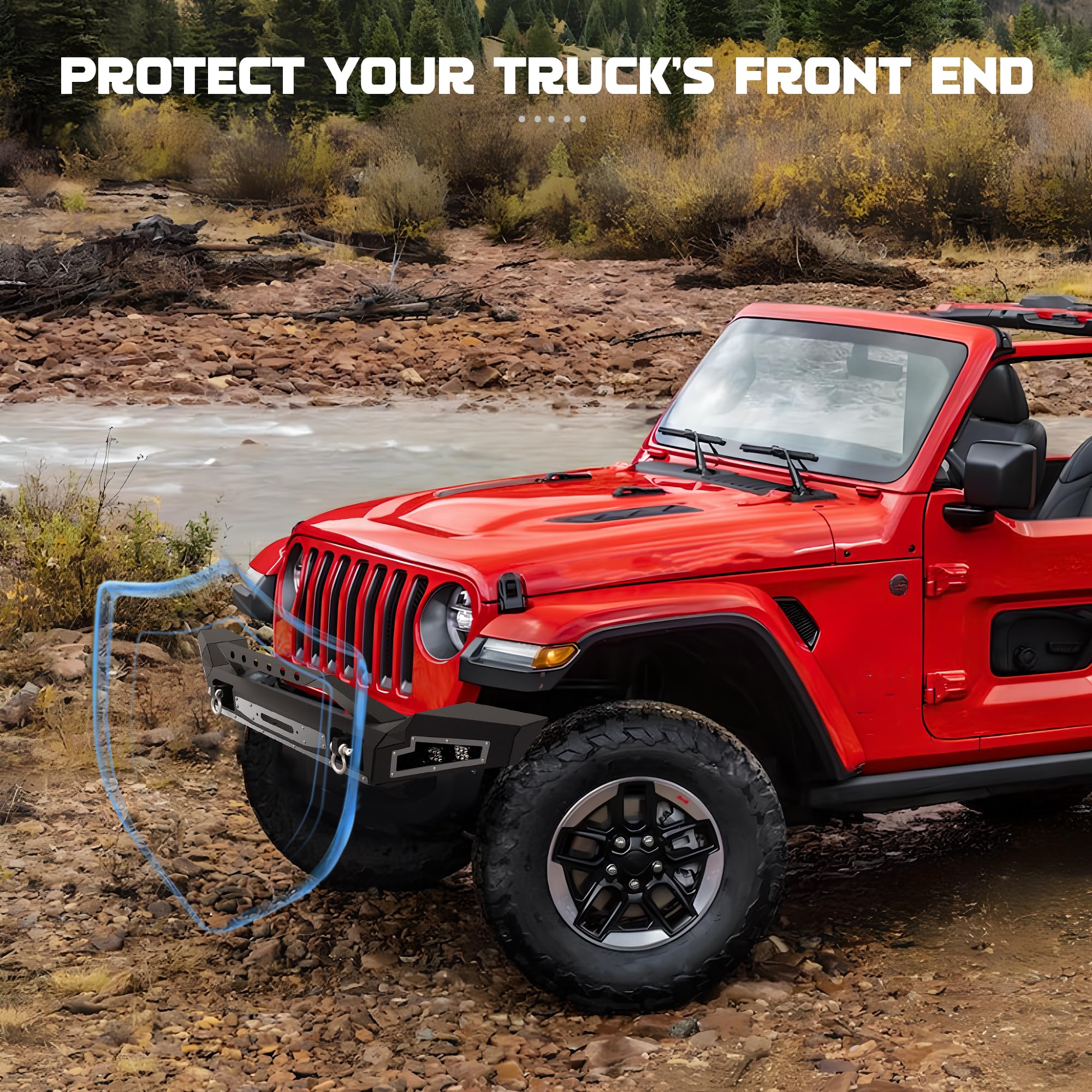 - 360 Degree Protection: The removable full-width bumper provides full protection in front and rear collisions, and if you want to install larger tires, you can remove the corner guards on both sides for better off-road functionality, and there are also lower guards to enhance protection against mud, sand, and flying rocks that can bitch into the vehicle