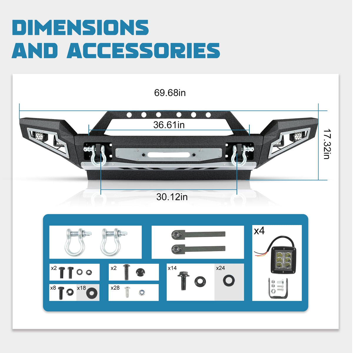 - Package Included: 1 x Front Bumper , 1 x Set of Mounting Hardware, 4 x Lamp Lights, 1 x Installation Instructions