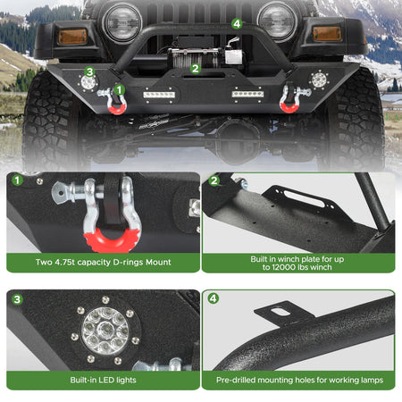 - Lighting in One: Rock crawler front bumper fit for Jeep Wrangler JK comes with two working light mounting holes at the top of the bumper (working lights not included). The front bumper rear bumpers combo have built-in LED lights to enhance the nighttime driving experience