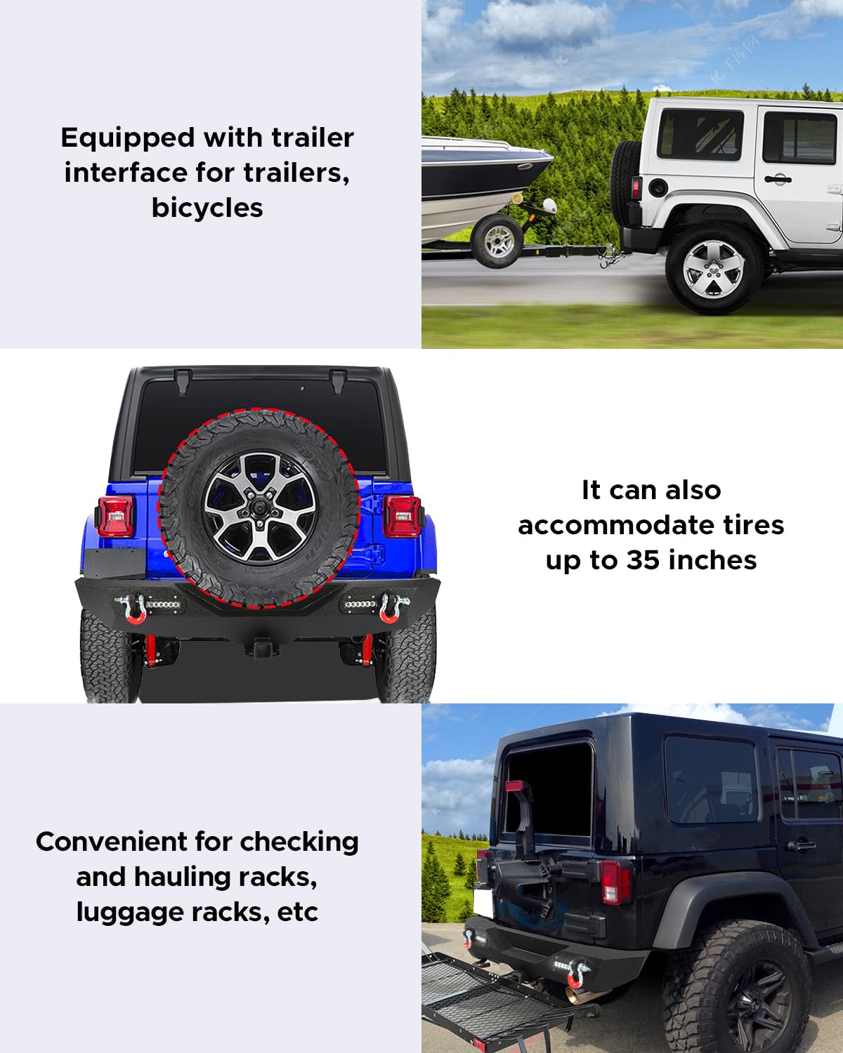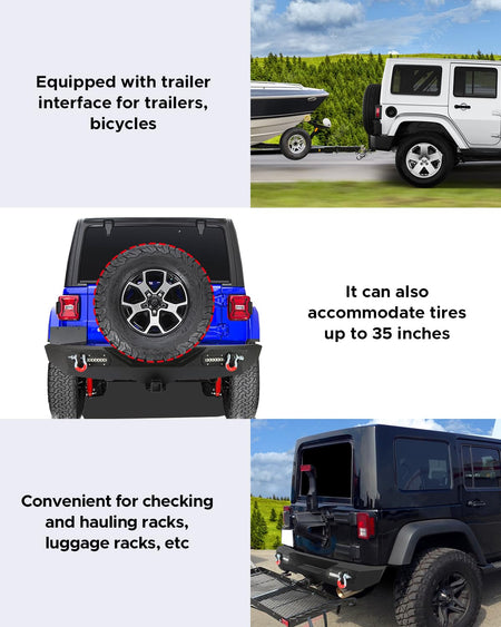 - Powerful Traction: Offroad bumper combo feature D-rings, front bumper with winch plate, and rear bumper with 2iinch trailer interface. (Tongue Weight: 600lbs, Maxmaim Loading Weight: 5,000lbs). Convenient for daily towing luggage racks, cargo racks, bikes, etc. A winch can also be installed to pull the car out of trouble when snow and mud make it impossible to drive (winch not included)