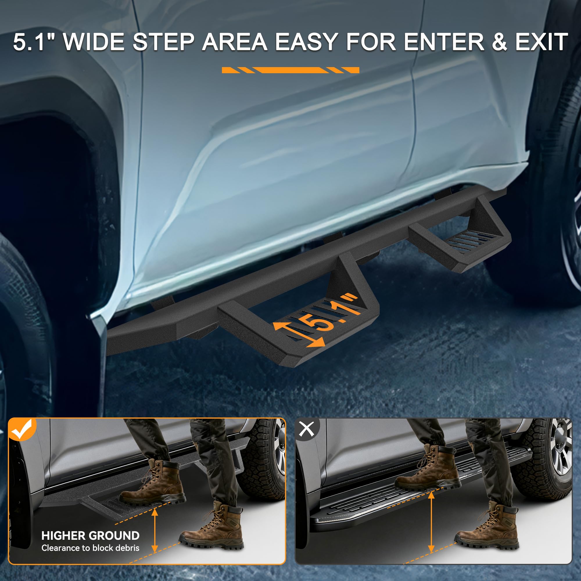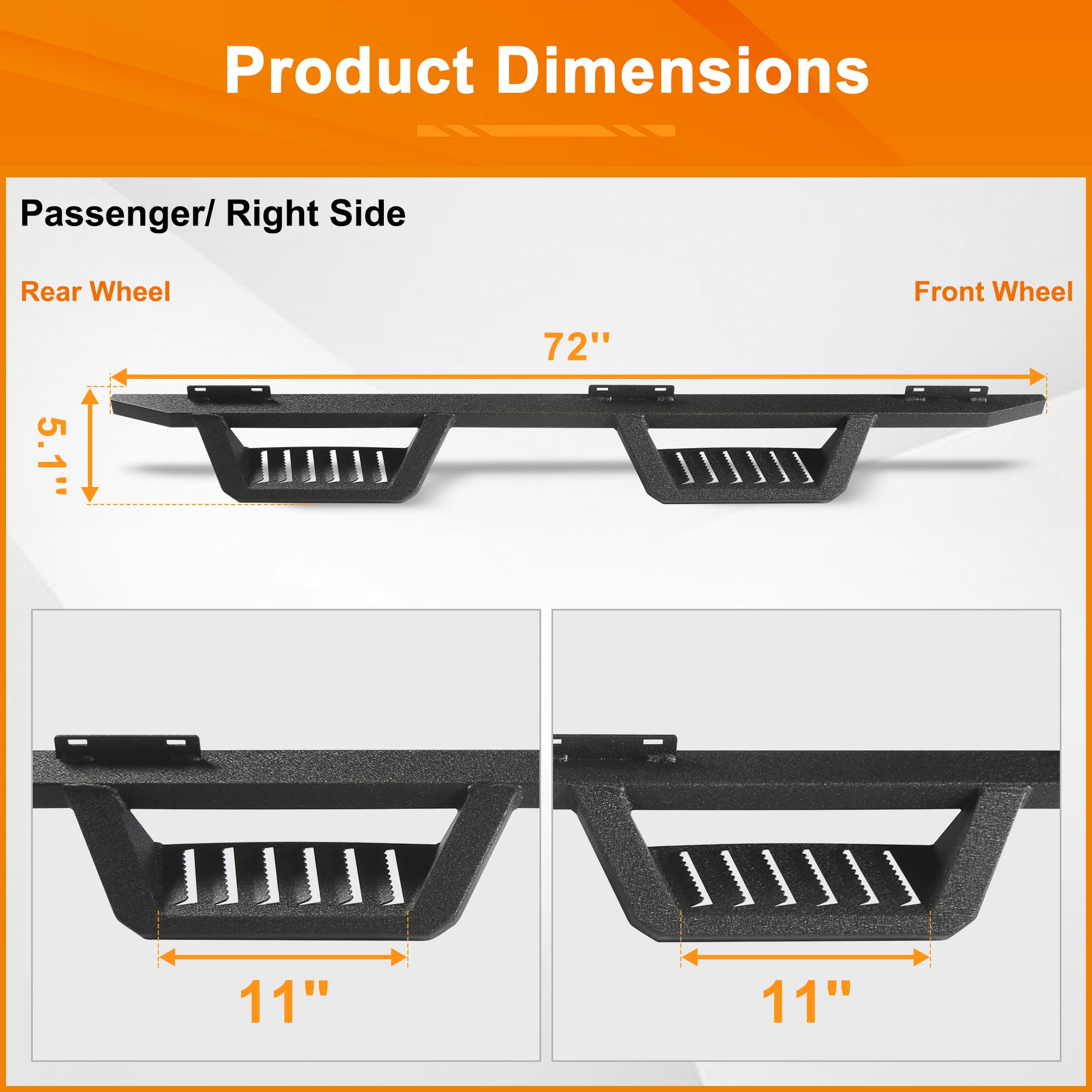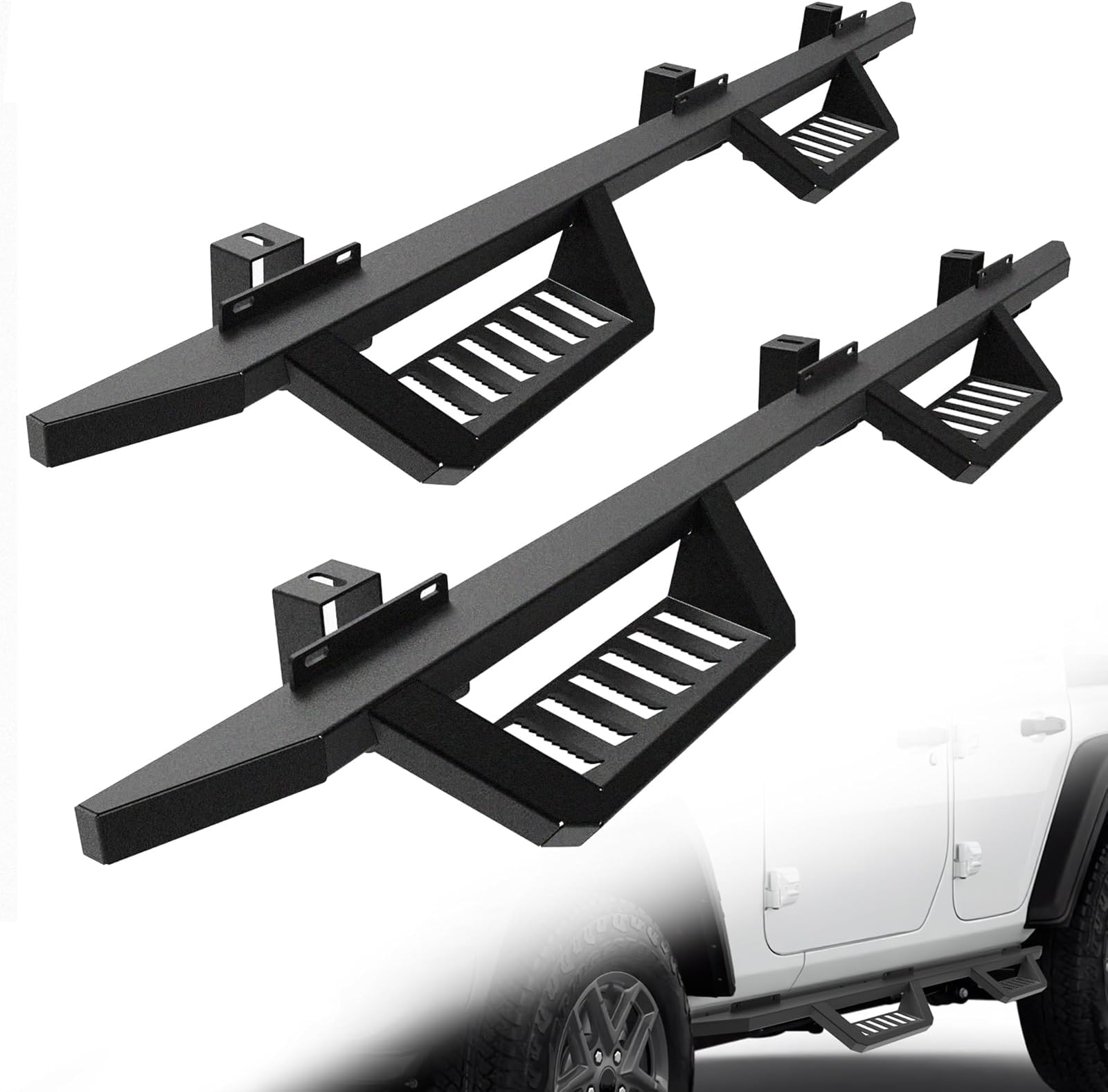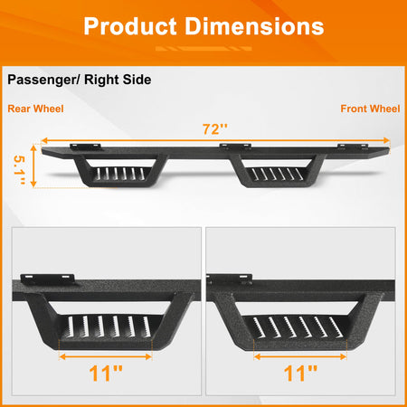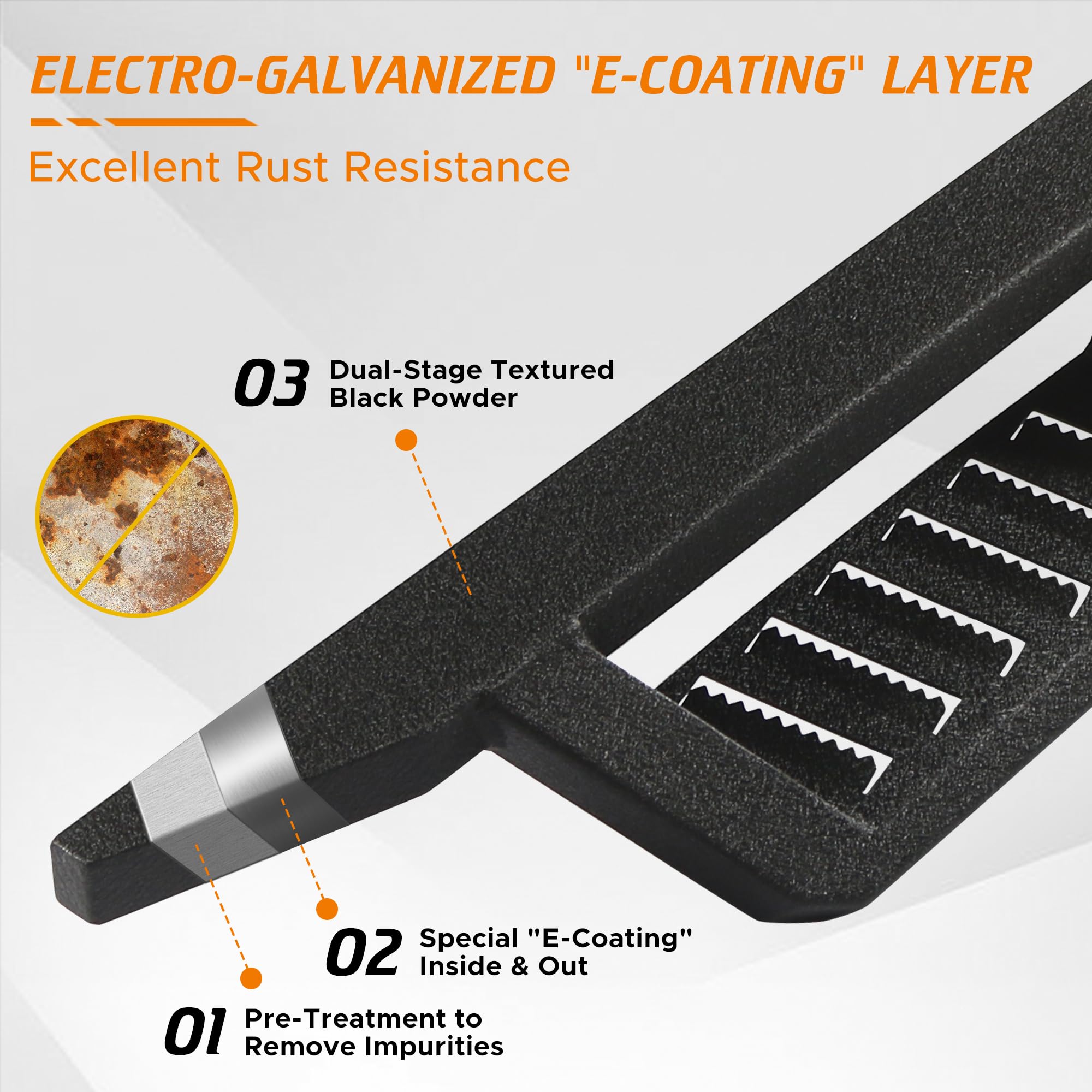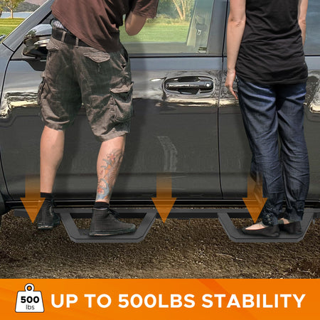 - Premium Material: Our side steps are make from heavy-duty carbon steel, which can supports up to 500 lbs. Reinforced powder-coated finish resists rust and harsh weather, ensuring long-term protection and sleek matte-black aesthetics