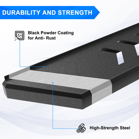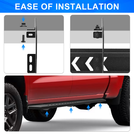 - Durability: The running board for silverado 1500 has a simple design, which is more durable than the original style and single running boards style. The side steps made of heavy duty carbon steel, and the surface of rock rail steps with black powder coating for rust resistant