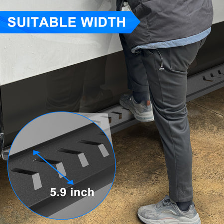 - Full-width Protection: Fitting for silverado 1500 side steps are made of strong carbon steel to reduce the damage caused by impacts and scratches of the vehicle. Up to 500lbs loading capacity for each side of rock rail steps and 5.9inch width fully for daily needs