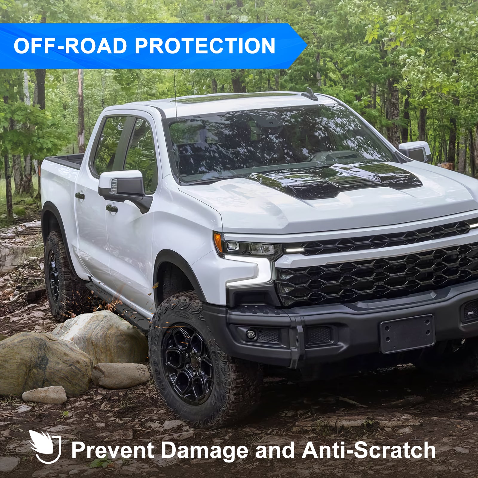 - Mutifunction Design: Running boards for silverado 1500 with off-road style are serrated and abrasive, providing a textured layer for increased grip. The sludge on the sole of the shoe can also be scraped by the serrated, to keep your car clean