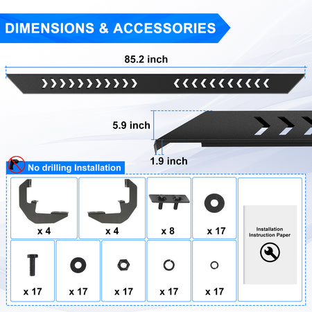 - Product List: Including 1 Pair of Side Steps fit for silverado 1500, 8 Brackets and Others Installation Hardware. No drilling Installation Instruction Paper and Installation Guide are also provided