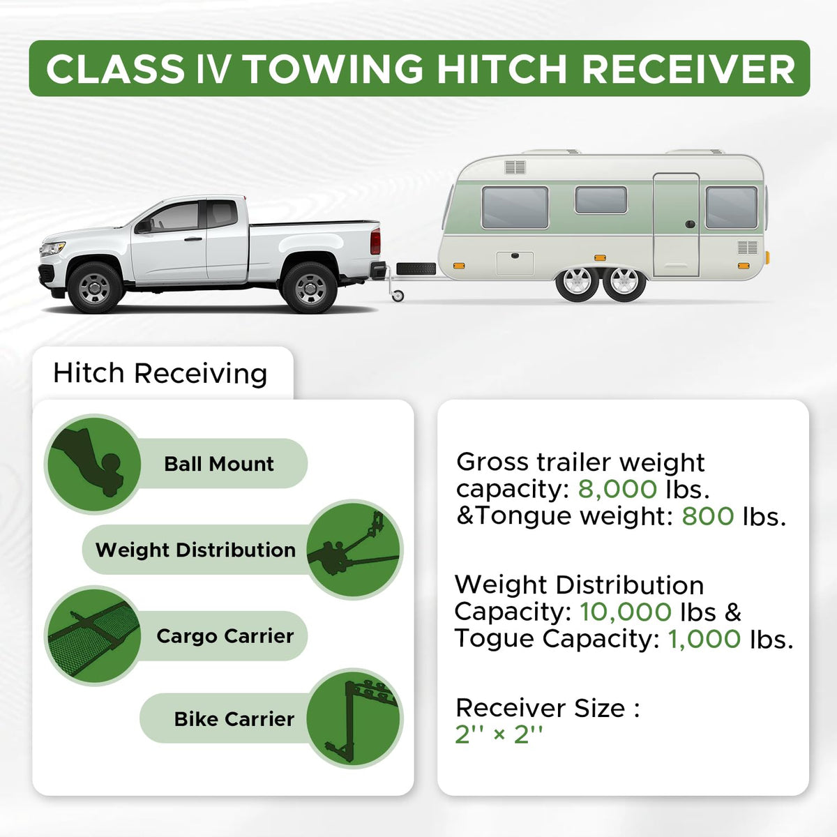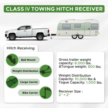 - DIMENSIONS: Gross trailer weight capacity: 8,000 lbs. &Tongue weight: 800 lbs. Weight Distribution Capacity: 10,000 lbs &Togue Capacity: 1,000 lbs. Class 4 Model. Equipping with standard 2inch receiver tube