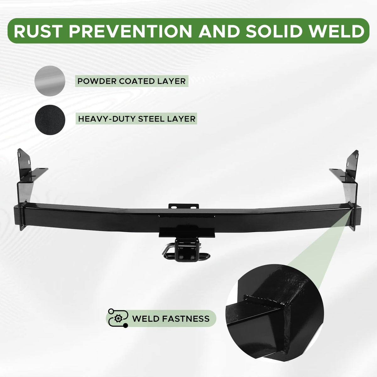 - DURABILITY: The trailer hitch receiver for chevy colorado features carbon steel for high strength. The black powder coating on the surface effectively resists rust. Moreover, the welded joint at the mouth is firm, providing safety protection for your journey
